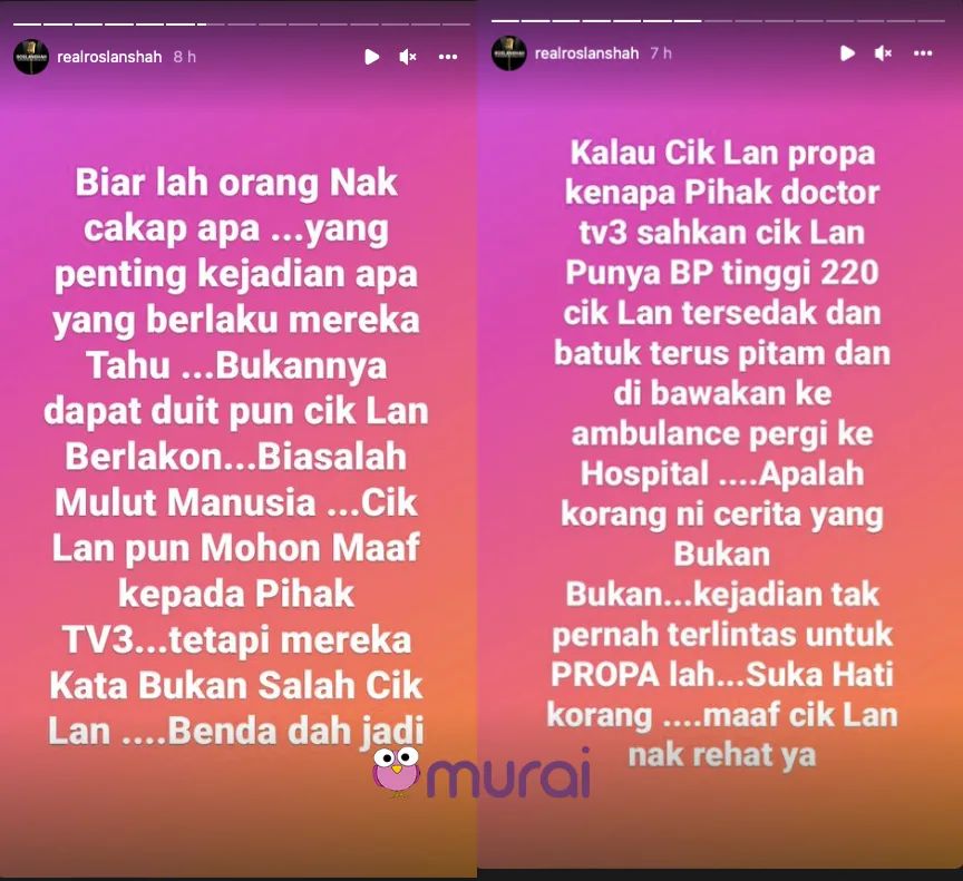 “Kalau Cik Lan propa kenapa pihak doktor TV3 sahkan Cik Lan punya BP tinggi 220. Cik Lan tersedak dan batuk terus pitam dan dibawakan ke ambulans pergi ke hospital. Apalah korang ini cerita yang bukan-bukan..kejadian tak pernah terlintas untuk propa lah..suka hati korang..maaf Cik Lan nak rehat ya” katanya lagi