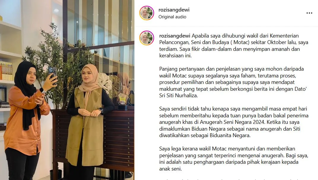Pengurus kepada Biduanita Negara, Datuk Seri Siti Nurhaliza iaitu Rozi Abdul Razak berkongsi video reaksi pertama penyanyi itu ketika mengetahui bakal menerima Anugerah Khas Biduan Negara.