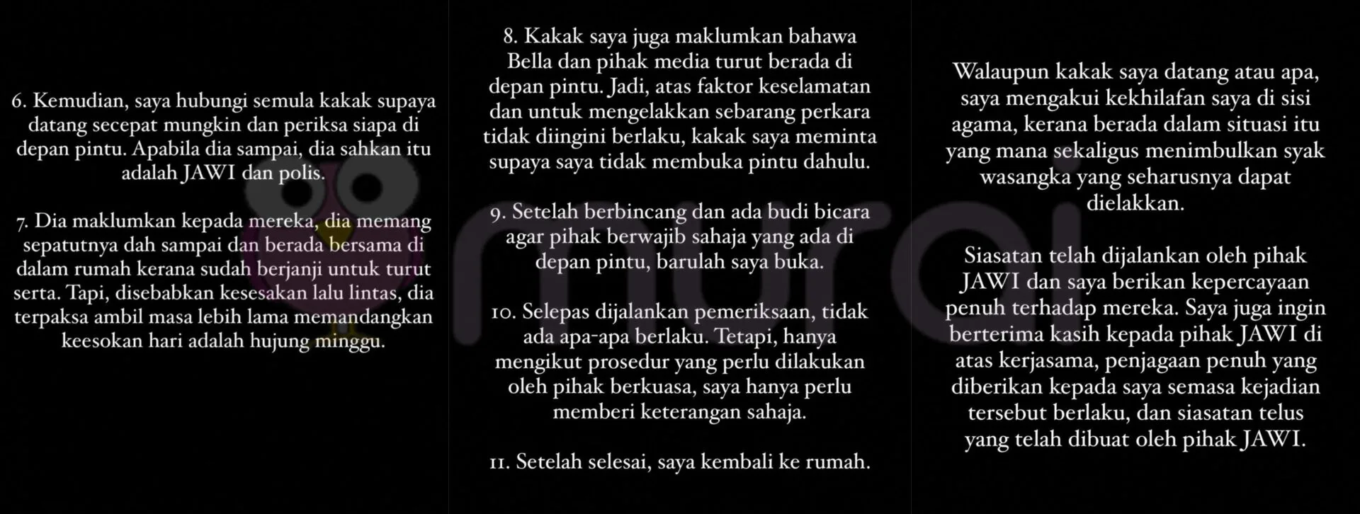 Kemudian, saya hubungi semula kakak supaya datang secepat mungkin dan periksa siapa di depan pintu. Apabbila dia sampai, dia sahkan itu adalah JAWI dan polis.”-jelas Ruhainies