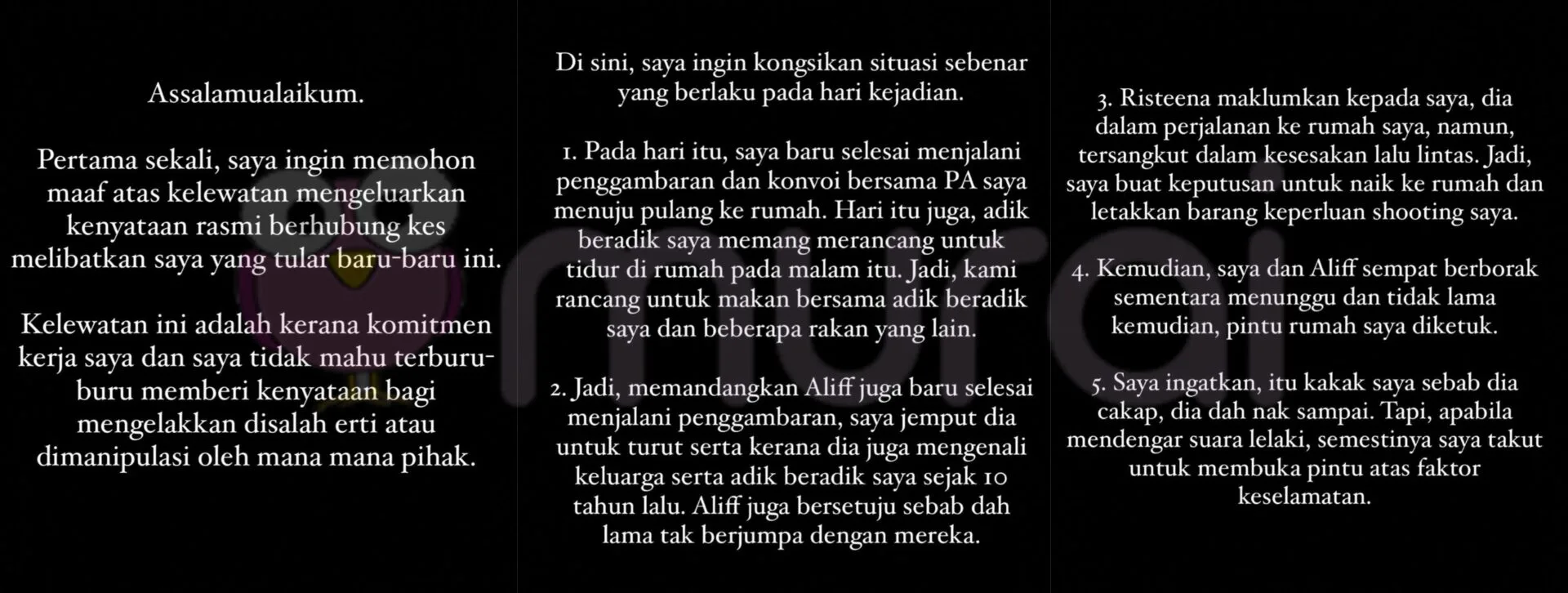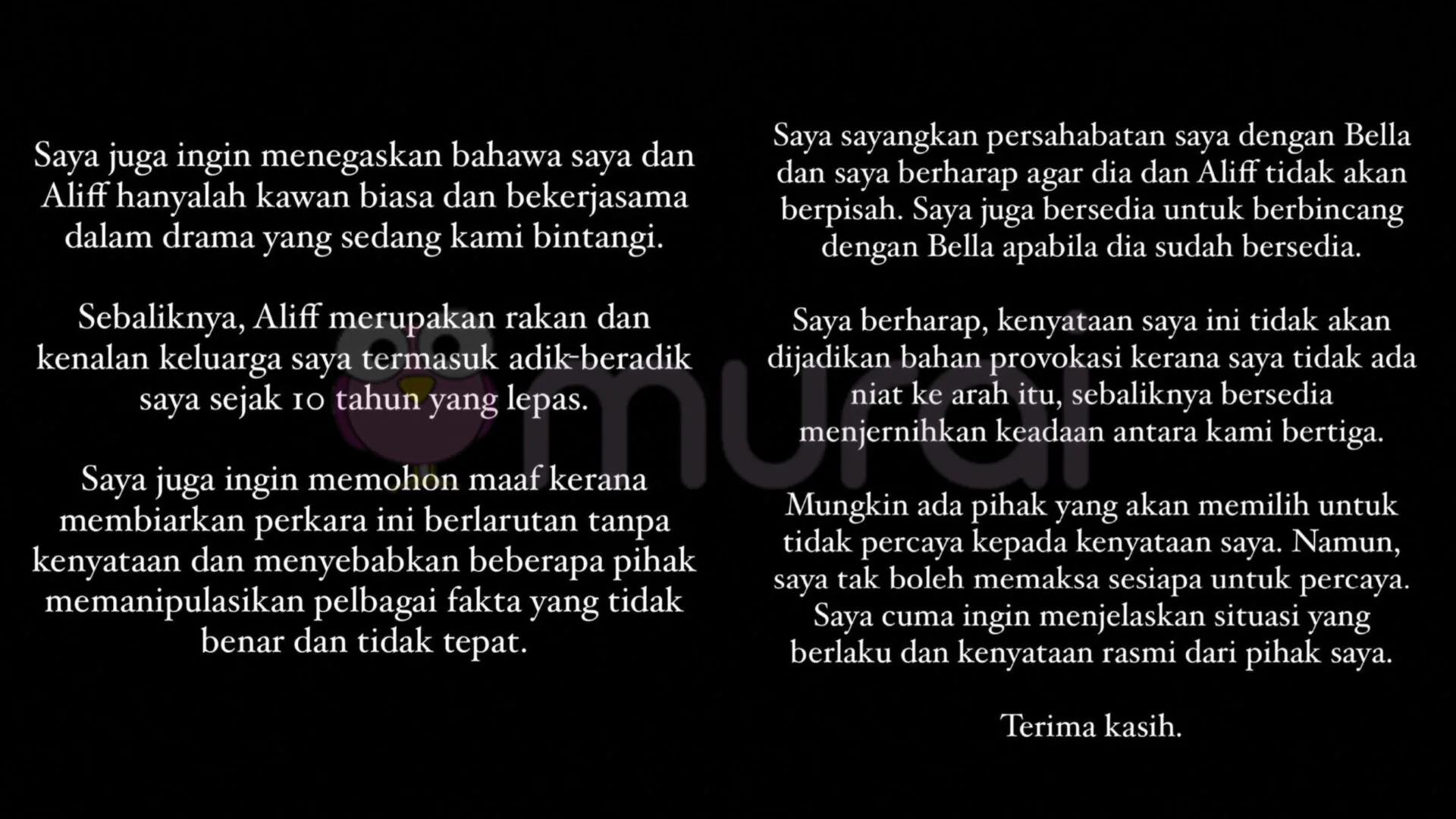“Saya juga ingin menegaskan bahawa saya dan Aliff hanyalah kawan biasa dan bekerjasama dalam drama yang kami bintangi. Sebaliknya, Aliff merupakan rakan dan kenalan keluarga saya termasuk adik-beradik saya sejak 10 tahun yang lepas.