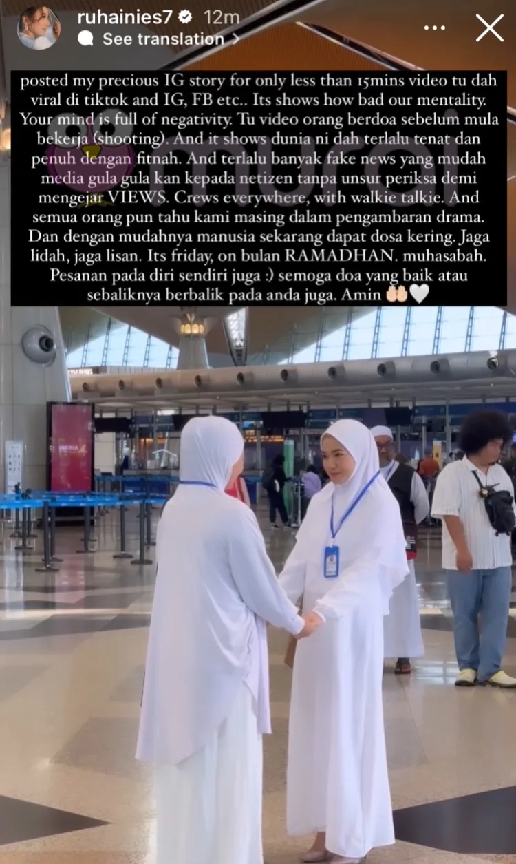 Tu video orang berdoa sebelum mula bekerja (shooting). Dan ia menunjukkan dunia ni dah terlalu tenat dan penuh dengan fitnah. Dan terlalu banyak berita palsu yang mudah media gula-gulakan kepada netizen tanpa unsur periksa demi mengejar views.”-tulis Ruhainies