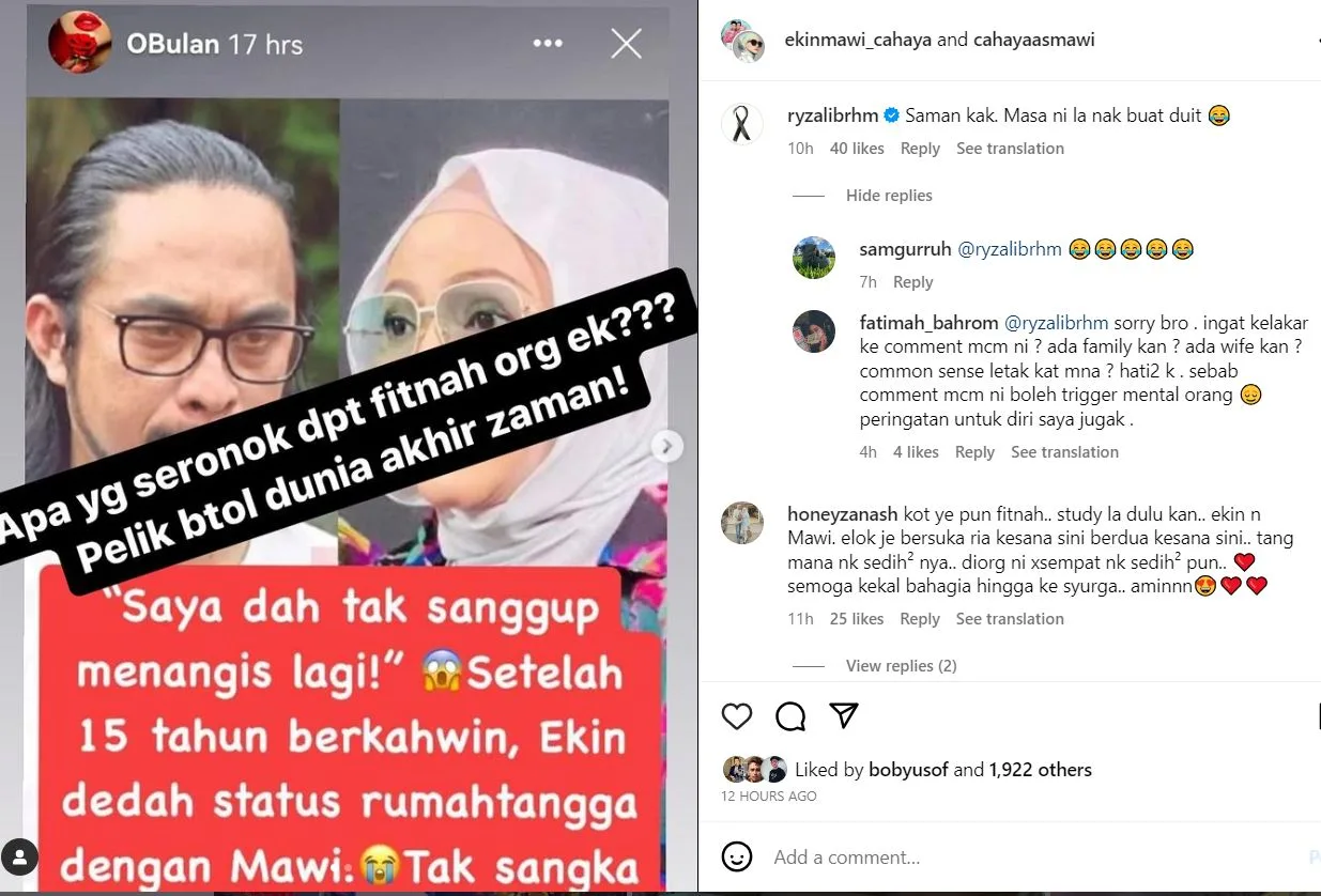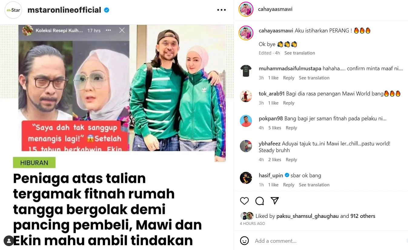 Menjenguh keruangan komen, ramai rakan selebriti dan peminat-peminat Ekin dan Mawi berasa kesal dengan berita fitnah yang tersebar di media sosial tersebut.