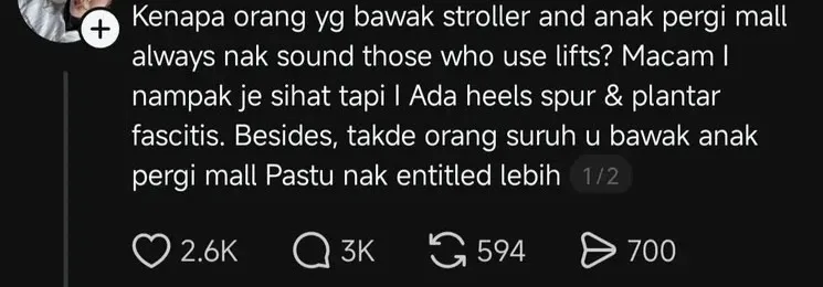 “Kenapa orang yang bawa stroller dan anak pergi mall sentiasa nak sound mereka yang guna lif? Macam saya nampak je sihat tapi saya ada heels spur dan plantar fasciitis. Lagipun takda orang suruh you bawa anak pergi mall pastu nak entitled lebih.”-tulis seorang netizen di Thread