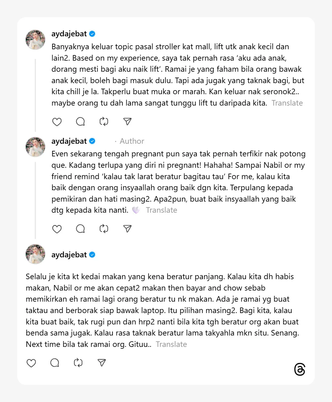 Ramai je yang faham bila orang bawa anak kecil, boleh bagi masuk dulu. Tapi ada juga yang tak nak bagi, but kita chill je la. Tak perlu buat muka atau marah. Kan keluar nak seronok-seronok. Mungkin orang tu dah lama sangat tunggu lif tu daripada kita.”-tulis Ayda di Thread