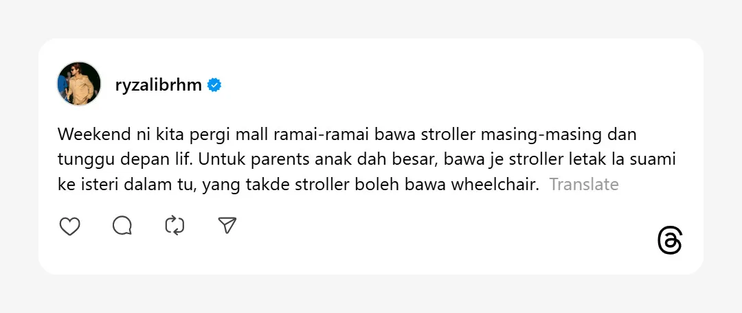 Untuk parent anak dah besar, bawa je stroller letak la suami ke isteri ke dalam tu, yang takde stroller boleh bawa wheelchair.”-tulis Ryzal di Thread