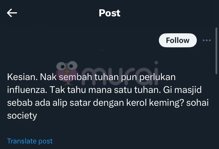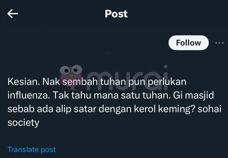 “Kesian. Nak sembah tuhan pun perlukan influenza. Tak tahu mana satu tuhan. Gi masjid sebab ada Alif Satar dengan Khairul Aming?.”-ciapan seorang netizen di X