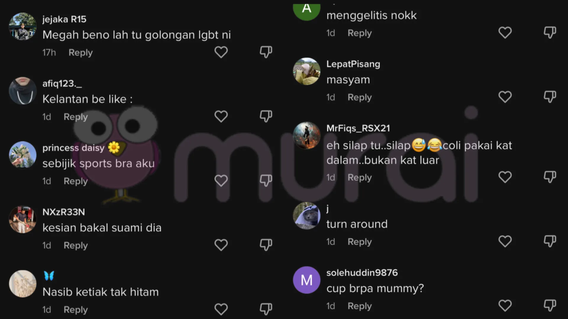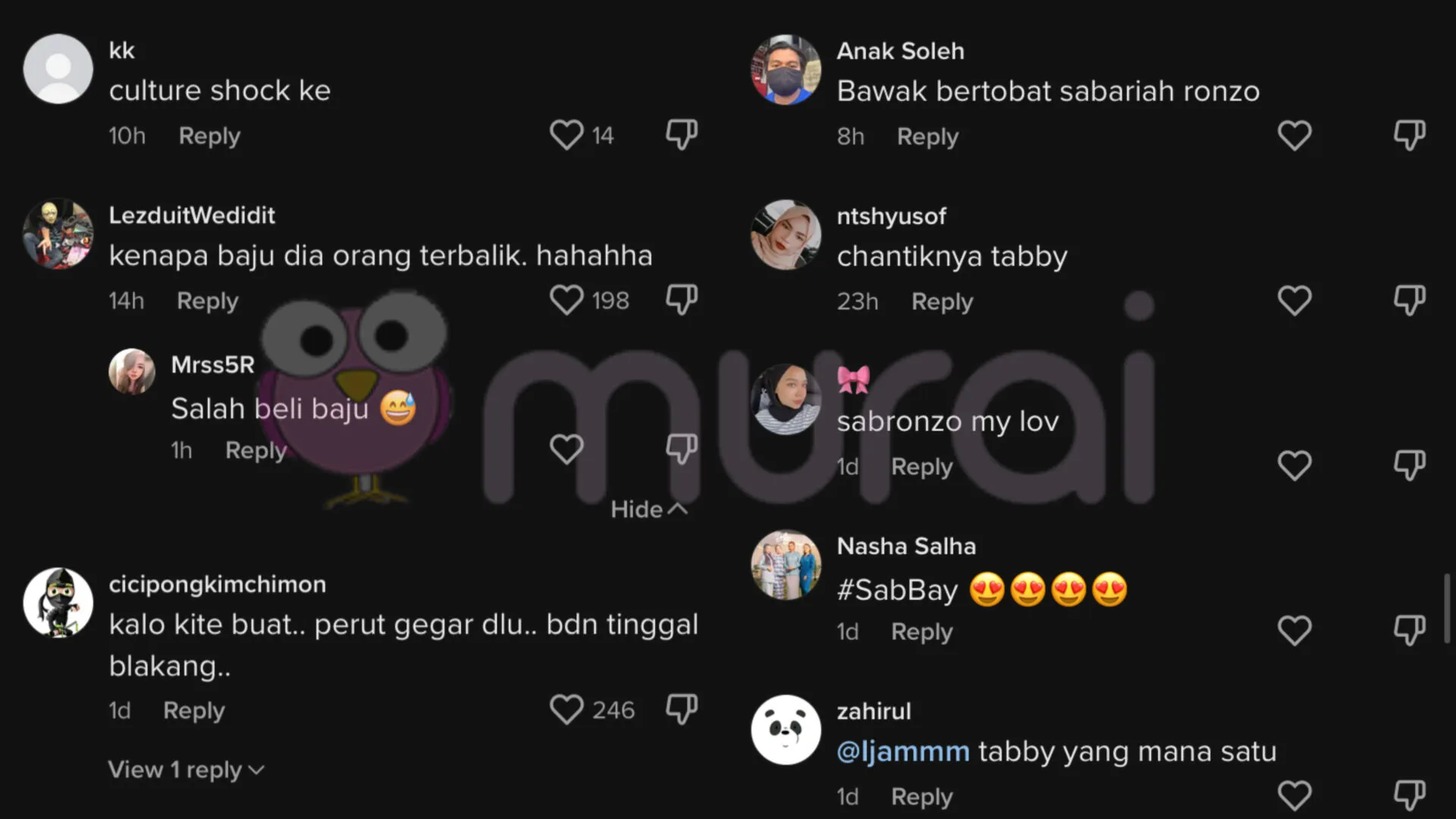 Tinjauan Murai MY di ruangan komen, rata-rata pengikutnya dan netizen mengkritik pemakaian Sabronzo yang mengenakan ‘tube’ tidak bersesuaian sebagai wanita yang beragama Islam, malah ada yang memintanya agar segera bertaubat.