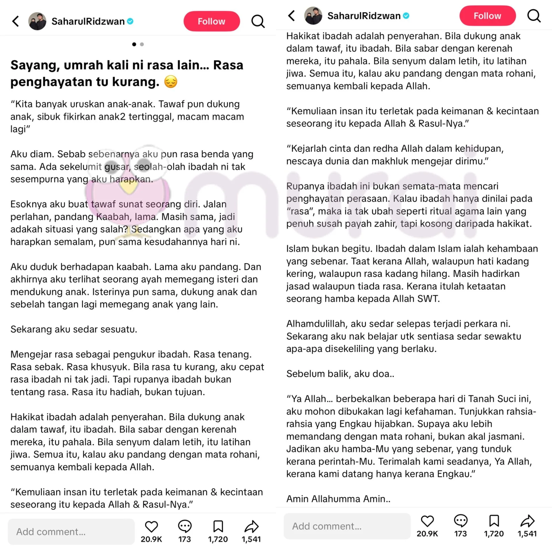 Kongsi Saharul Ridzwan di TikTok, dia dan isteri merasakan seolah-olah ibadah Umrah kali ini tidak sempurna seperti yang diharapkan kerana banyak menguruskan anak-anak ketika beribadah. Malah, dalam fikiran juga turut terfikir jika anak-anak mereka tertinggal ketika di Tanah Suci Mekah.