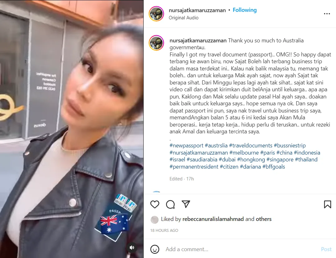 “Terima kasih banyak-banyak kerajaan Australia. Akhirnya saya mendapat dokumen pelancongan (passport)..OMG!! So happy dapat terbang ke awan biru, Now Sajat boleh lah terbang business trip dalam masa terdekat ini.”-Nur Sajat
