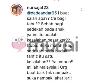 “Saya buat salah apa? Cuba bagi tahu? Sebab bagi sedekah pada anak yatim itu adalah kesalahan besar ke? Cuba. Buka mata. Bagi sedekah pada budak tahfiz itu satu kesalahan Ya ampun! Ini lah Malaysia!! Orang buat baik tak nampak, suka nampak jahat jer!!”- balasnya.