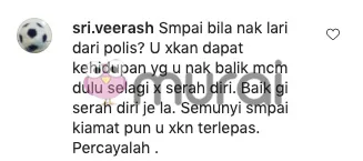 “Sampai bila nak lari dari polis? Awak tidak akan dapat kehidupan yang anda nak balik macam dulu selagi tak serah diri. Baik pergi serah diri je la. Sembunyi sampai kiamat pun anda tidak akan terlepas. Percayalah”- tulis dengan yakin salah seorang netizen dengan akaun bernama @sri.veerash.