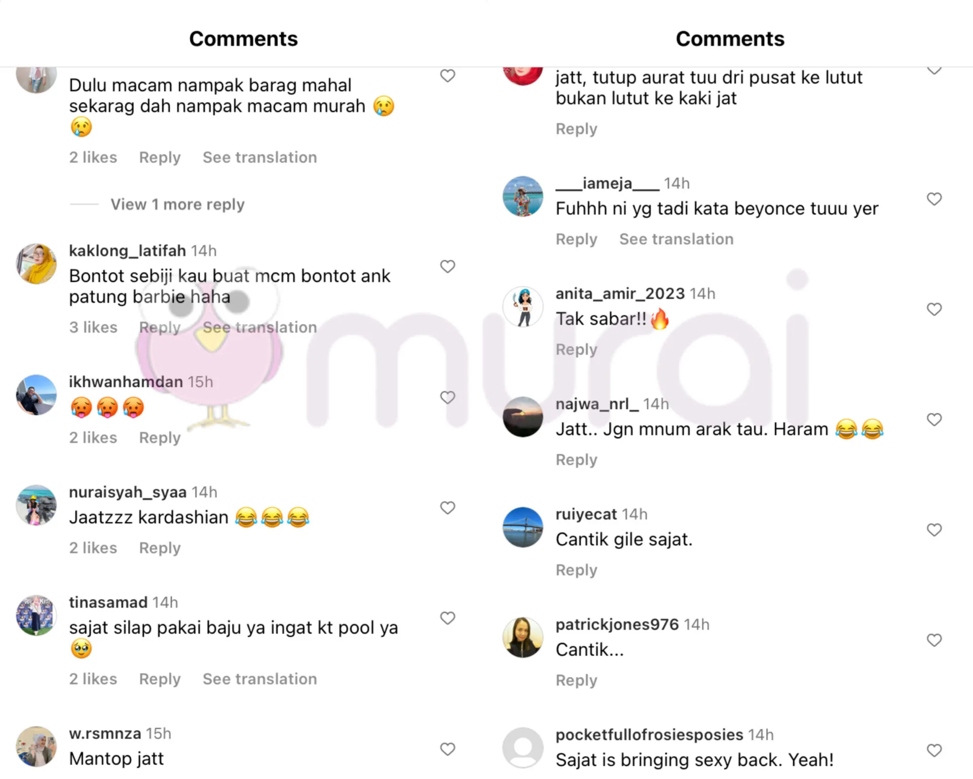 “Macam plastik dowh tengok. Dah-dah la bang jat. Baliklah ke pangkal jalan. Pintu taubat masih terbuka. Mati tak kenal usia tua muda. Pondan ke asli ke. Tak lambat sedikitpun . Allah masih bagi abang jat peluang sebenarnya. Semoga Sajat sempat bertaubat.”