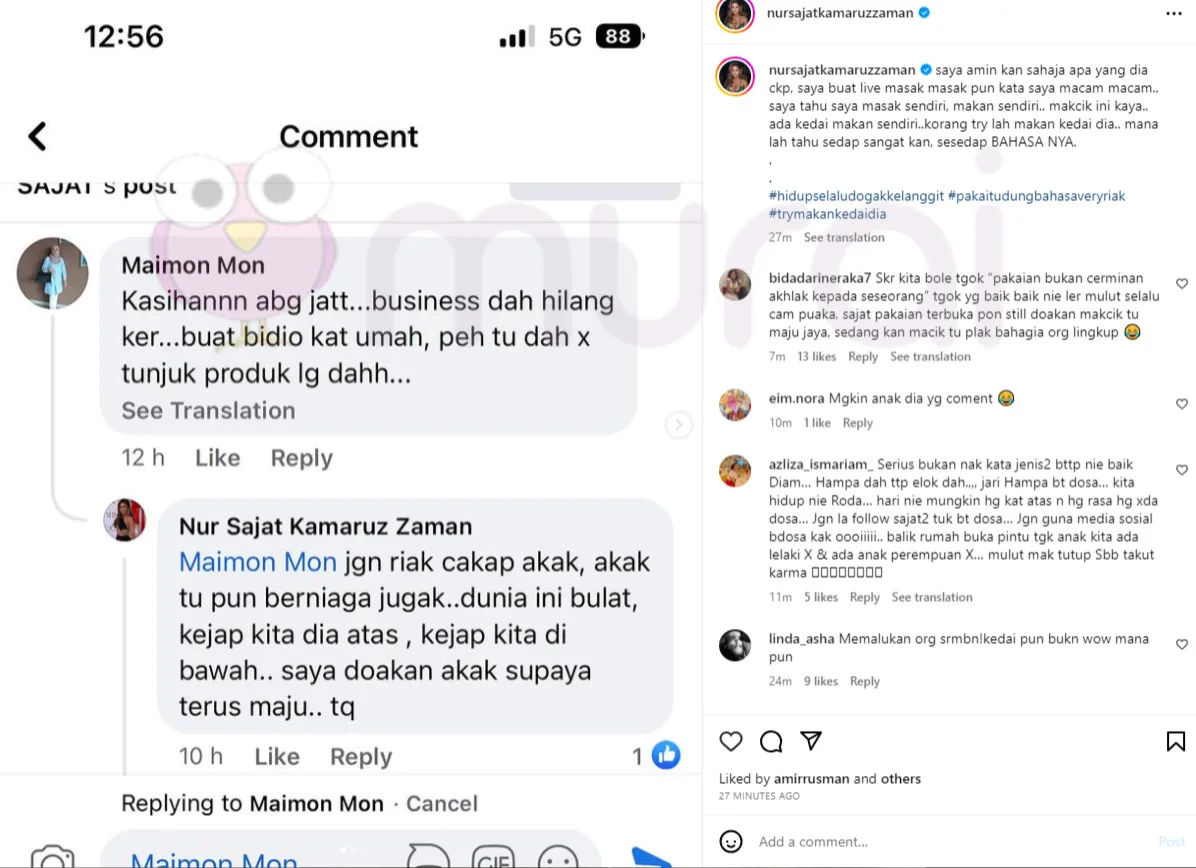 Nur Sajat menerusi hantaran di Instagram, dilihat memuatnaik tangkap layar komen salah seorang netizen yang dikenali sebagai Maimon yang ‘kasihan’ melihatnya kehilangan perniagaan dan hanya membuat stream live video tanpa menunjukkan sebarang produk.