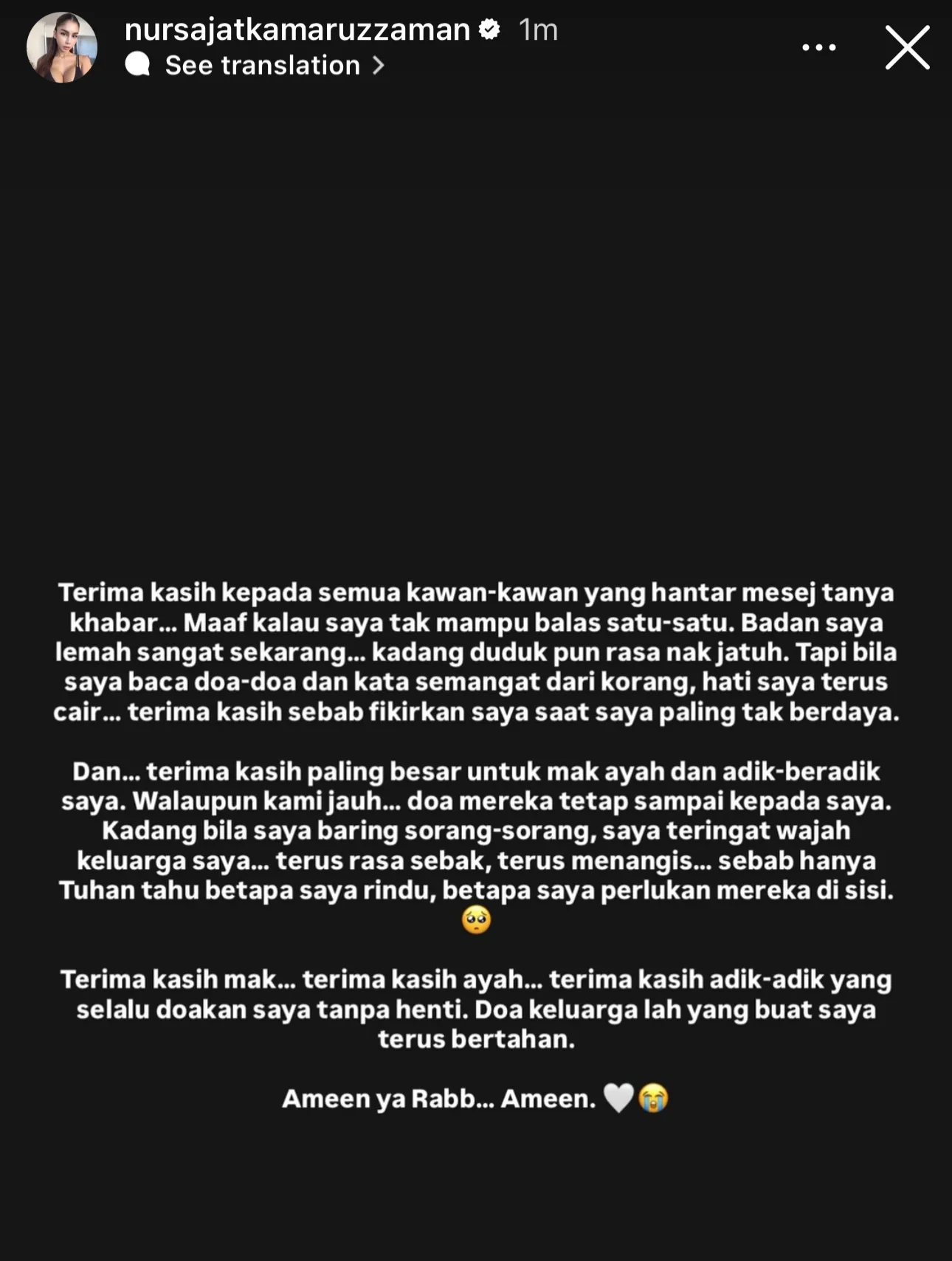 “Terima kasih kepada semua kawan-kawan yang hantar mesej tanya khabar. Maaf kalau saya tak mampu balas satu-satu. Badan saya lemah sangat sekarang. Kadang duduk pun rasa nak jatuh. Tapi bila saya baca doa-doa dan kata semangat dari korang, hati saya terus cair. Terima kasih sebab fikirkan saya saats aya paling tak berdaya.