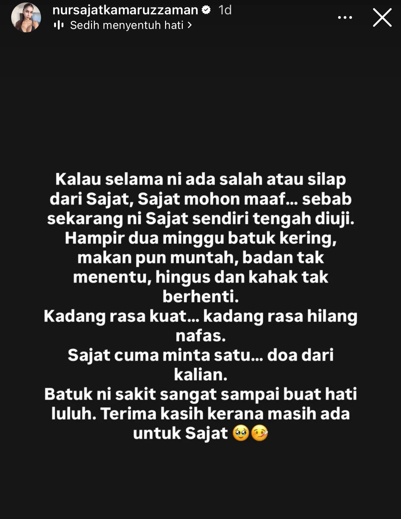 Ada orang doakan kita, tapi ada juga yang sanggup mengutuk walaupun kita terbaring di hospital. Saya bukan minta simpati. Cuma minta satu doa.”-kongsi Sajat di Instagram