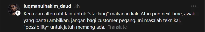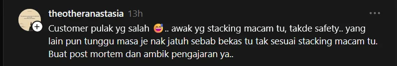 Namun begitu, tidak kurang juga yang melihat isu ini dari sudut berbeza. Mereka berpendapat cara susunan bekas makanan yang terlalu tinggi dan tidak stabil turut menyumbang kepada risiko kejadian.
