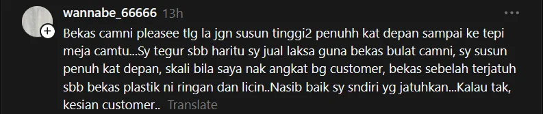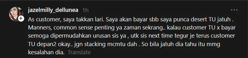 Dalam masa yang sama, ada juga suara yang mengajak supaya situasi ini dilihat dengan lebih empati. Bagi sesetengah peniaga, kejadian seperti ini dianggap sebagai “tidak ada rezeki” dan dijadikan pengajaran untuk penambahbaikan di masa hadapan.