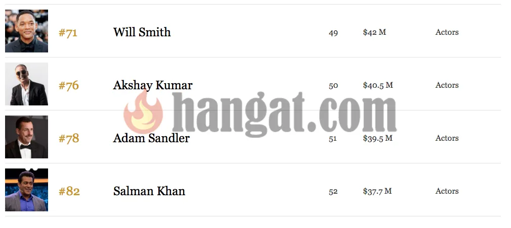 Salman Khan dengan US$ 37.7 juta atau sekitar RM 152 juta berada di posisi ke-82. Hal itu sangat mengganggakan. Wajarnya Salman Khan di negara asalnya, India, masuk dalam senarai aktor dengan bayaran tertinggi.