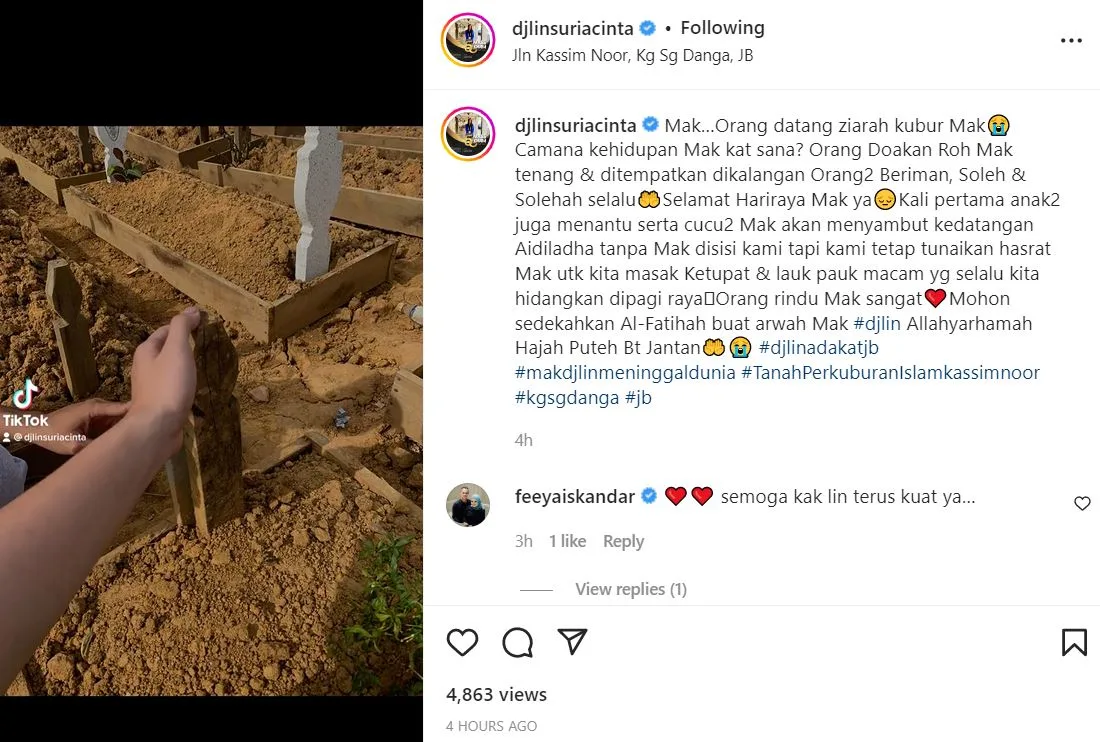 Melihat di Instagram miliknya, DJ Lin ada memuat naik satu video menunjukkan dia sedang melawat kubur arwah ibunya.