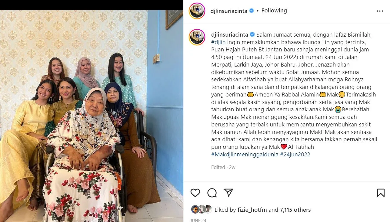 Sebelum ini, ibu penyampai radio Suria FM, DJ Lin, telah menghembuskan nafas terakhir akibat penyakit buah pinggang di kediaman mereka di Larkin Jaya, Johor Bahru pada jam 4.50 pagi.