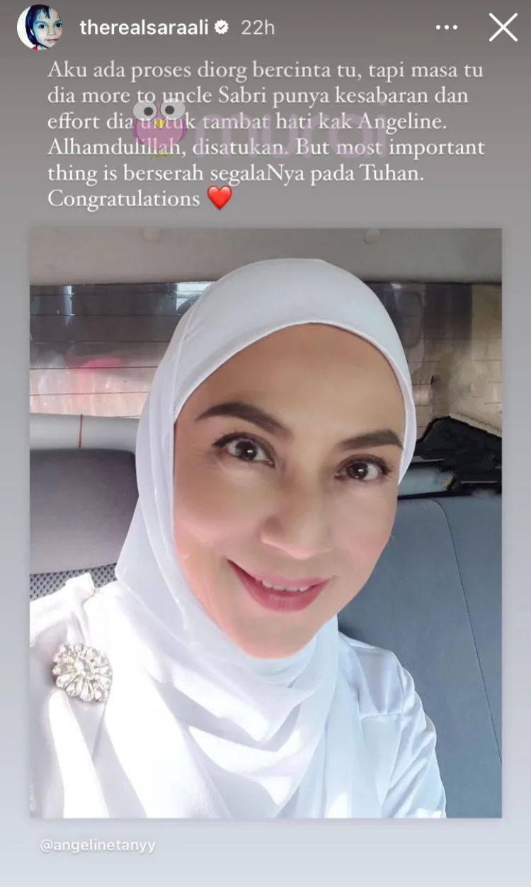 Selain itu, Pelakon, Sara Ali menerusi hantaran di Insta Stories, yang menjadi saksi percintaan pasangan ini turut mendedahkan sikap Sabri yang berjaya menambat hati Angeline sehingga sah menjadi suami isteri.