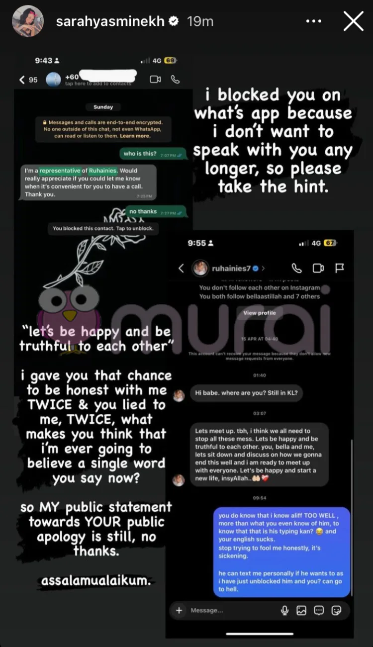 “Saya block awak di WhatsApp kerana saya tak mahu cakap dengan awak lagi. So please take the hint.”-tulis Sarah Yasmine