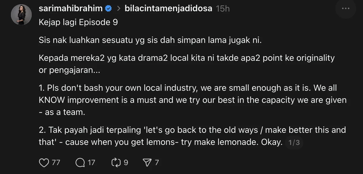 “Sis nak luahkan sesuatu yang sis dah simpan lama juga ni. Kepada mereka yang kata drama-drama lokal kita ni tak ada point, tak ada originality atau pengajaran…” tulisnya.
