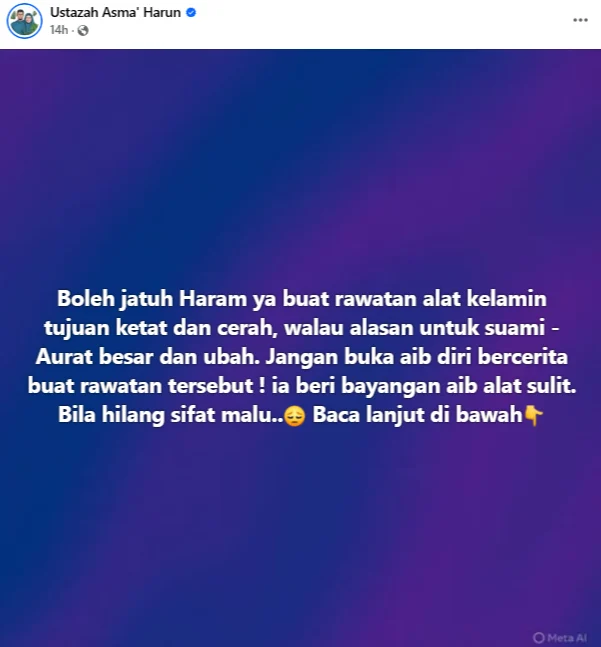 Jangan buka aib diri sendiri bercerita buat rawatan tersebut! Ia beri bayangan aib alat sulit. Bila hilang sifat malu …”-tulis Ustazah Asma di Facebook