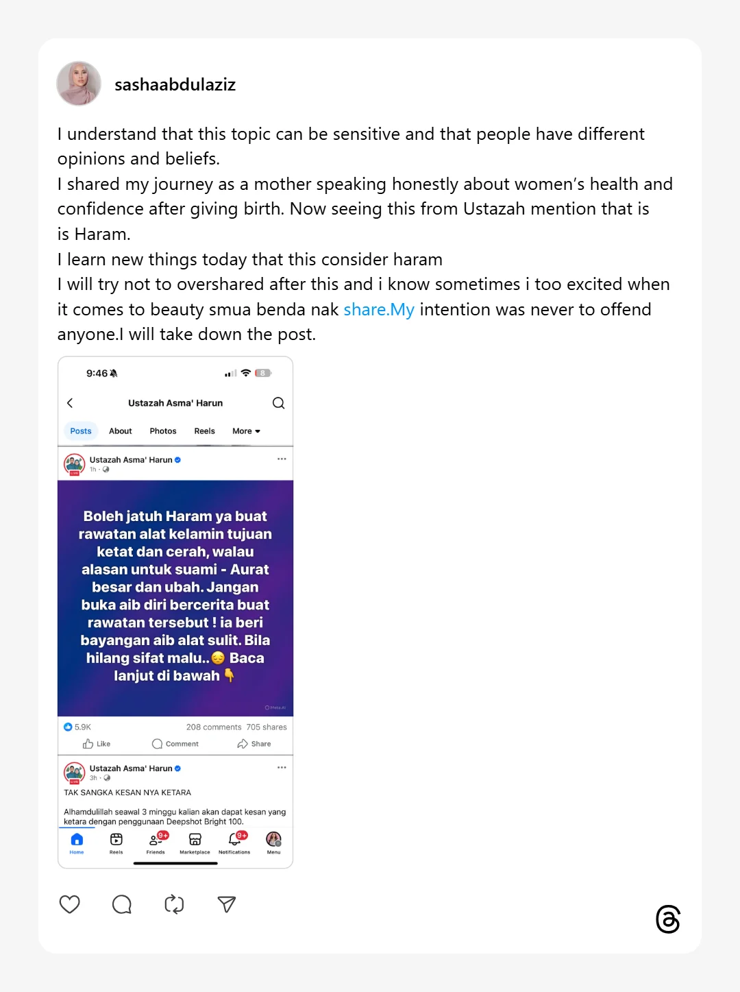 Kini melihat Ustazah menyebut bahawa hukumnya haram. Saya mempelajari benda baharu hari ini bahawa rawatan ini dikira haram. Saya akan cuba untuk tidak overshared semua ini dan saya tahu kadangkalan saya terlalu teruja bila ia mengenai kecantikan, semua benda nak share. Niat saya tidak pernah untuk menyinggung semua orang. Saya akan turunkan posting tersebut.”-tulis Sasha di Threads