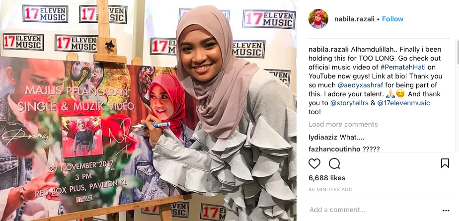 “Alhamdulillah.. Finally i been holding this for TOO LONG. Go check out official music video of #PematahHati on YouTube now guys! Link at bio! Thank you so much @aedyxashraf for being part of this. I adore your talent. ??? And thank you to @storytellrs & @17elevenmusic too!”
