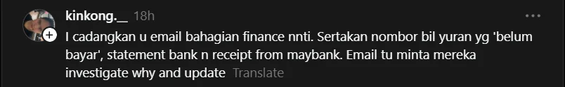 Seorang pengguna turut menegaskan bahawa isu seperti ini sering berlaku kerana segelintir pihak mengambil mudah tanggungjawab mereka, manakala yang lain pula menasihatkan agar semua bukti pembayaran seperti resit dan penyata bank disertakan dalam emel rasmi untuk siasatan lanjut.