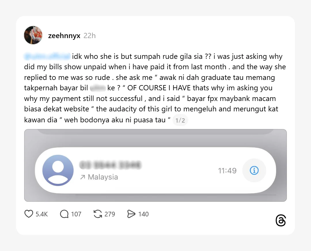 Namun, respons yang diterima didakwa bersifat sinis dan tidak profesional, termasuk soalan yang mempertikaikan rekod pembayaran serta nada suara yang dianggap merendahkan.