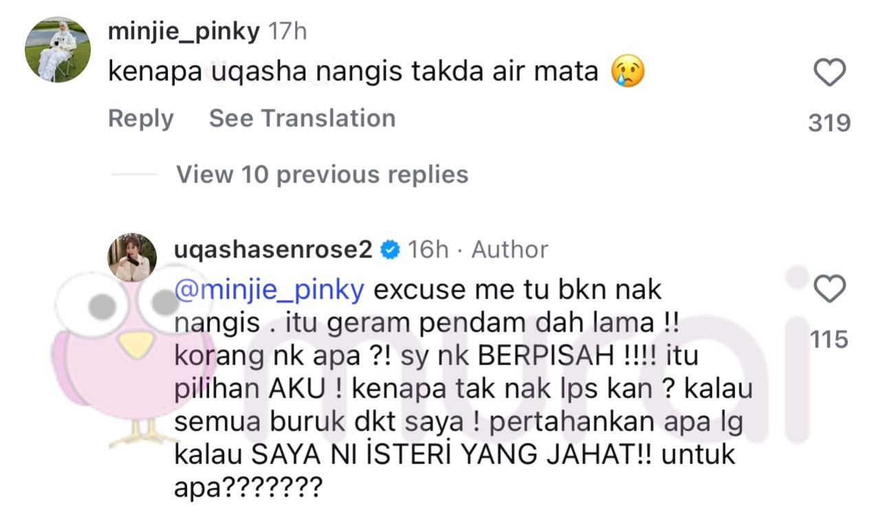 Tidak berdiam diri, Uqasha turut memberikan respon terhadap salah seorang netizen yang mempersoalkan Uqasha yang menangis namun tidak mempunyai air mata di Mahkamah.