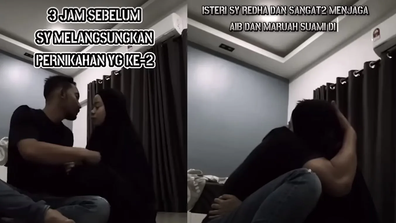 Menerusi video tersebut kelihatan lelaki berkenaan menunaikan solat subuh sambil diiringi airmata tiga jam sebelum isteri pertamanya dimadukan.