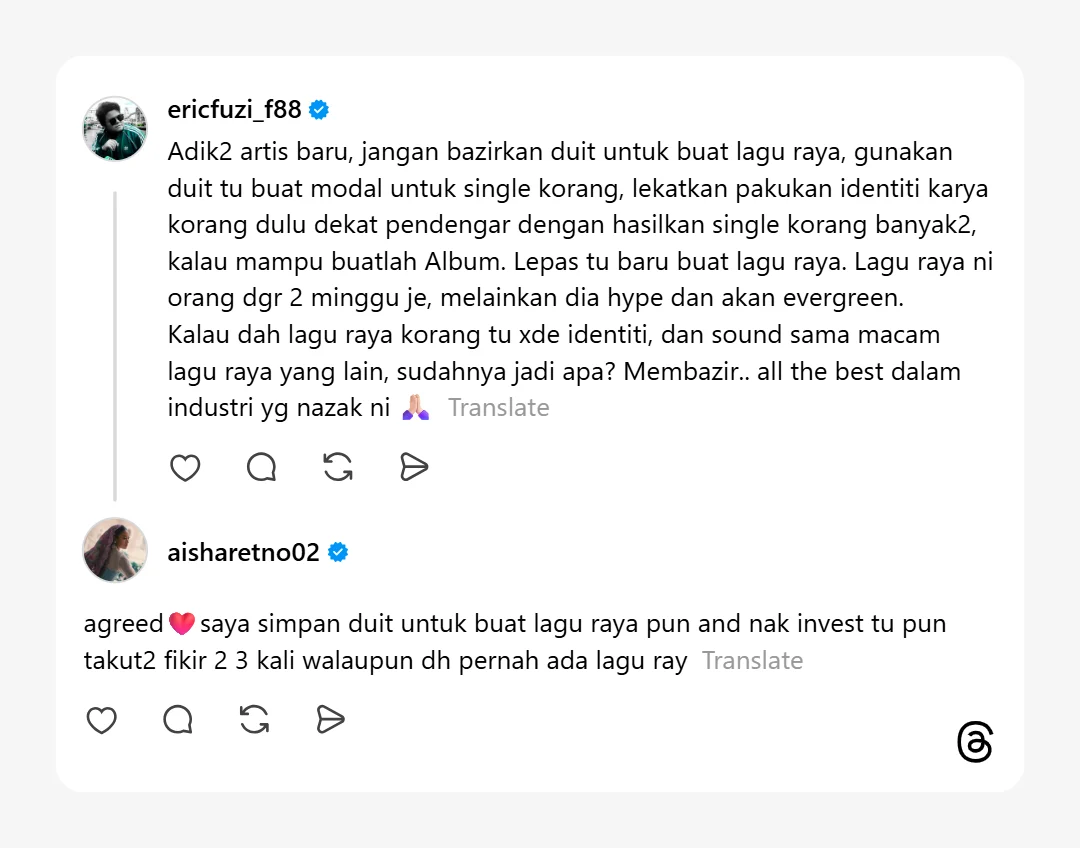 Kalau mampu, buatlah album. Lepastu baru buat lagu raya. Lagu raya ni orang dengar 2 minggu je, melainkan dia hype dan evergreen. Kalau dah lagu raya korang tu takde identiti, dan sound sama macam lagu raya yang lain, sudahnya jadi apa? Membazir, all the best dalam industri yang nazak ni.”-tulis Eric di Threads
