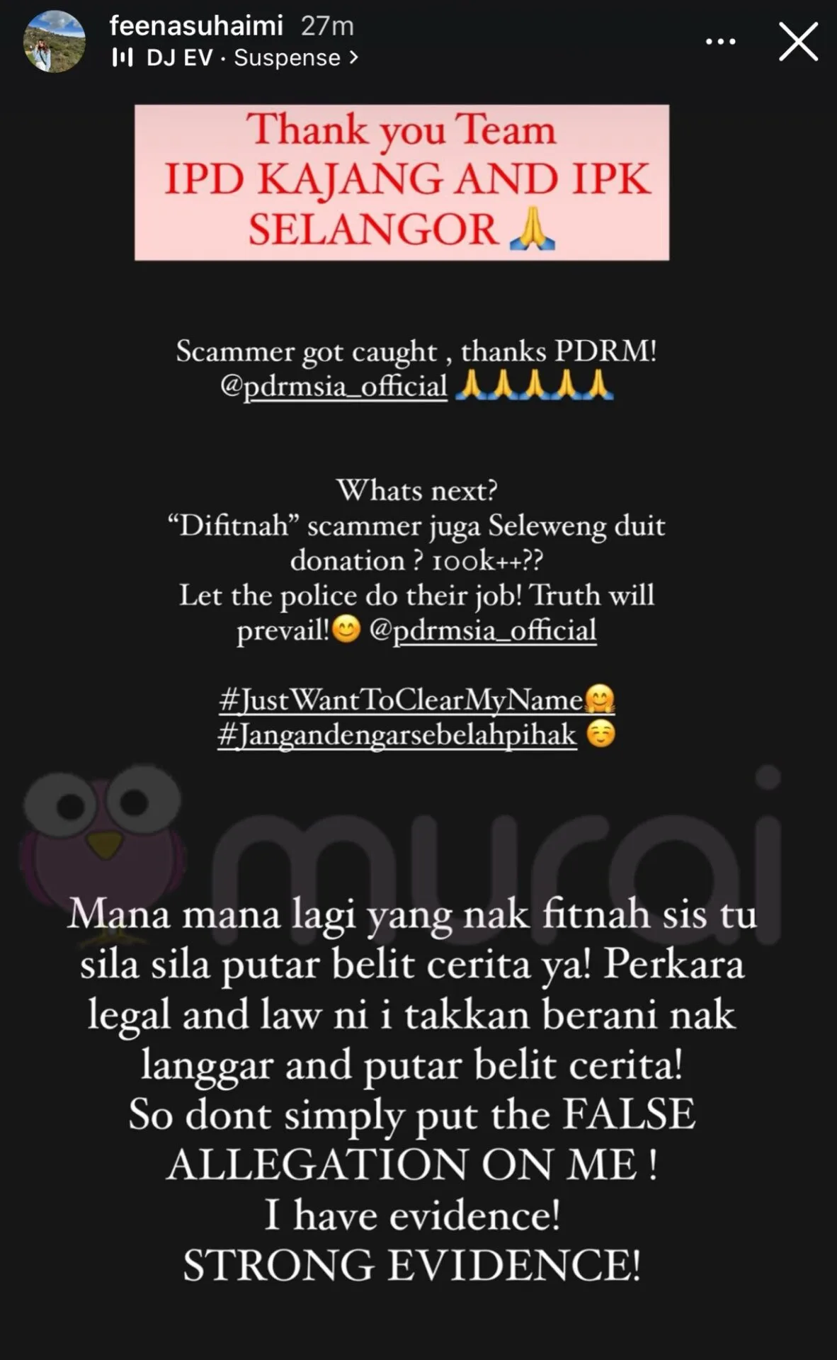 “Terima kasih Team IPD Kajang dan IPK Selangor. Scammer telah ditangkap. Apa seterusnya? ‘Difitnah’ Scammer juga seleweng duit donation? 100k++? Biarkan polis melakukan kerja mereka! Kebenaran akan terjawab!