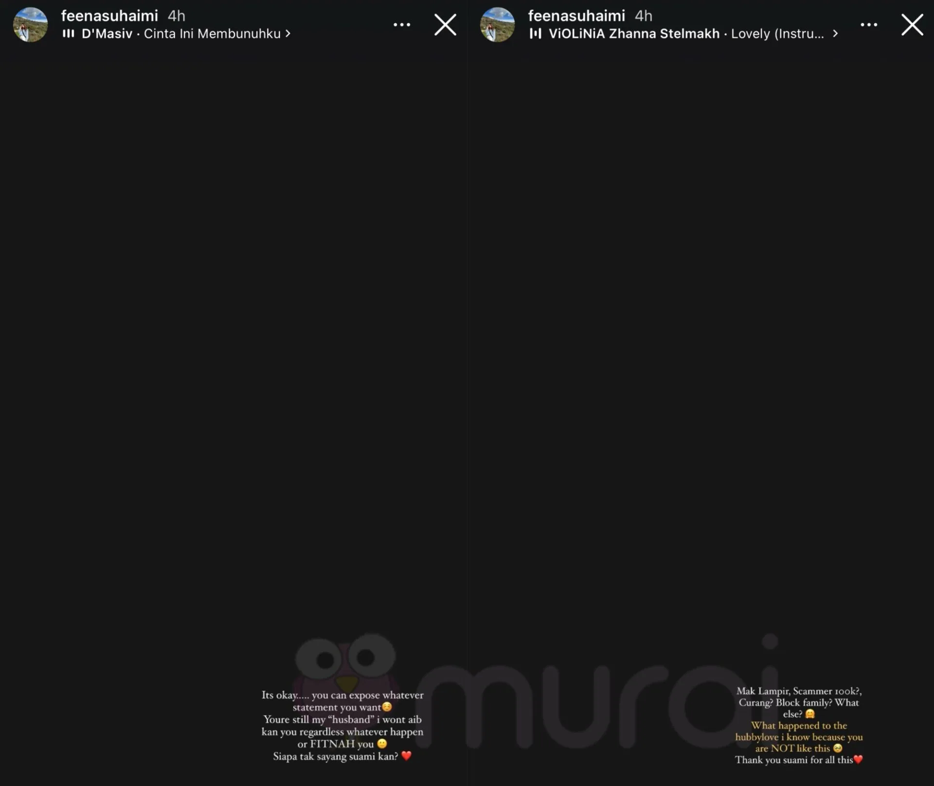 “Tidak mengapa, anda boleh memberikan apa-apa sahaja kenyataan anda mahu. Anda masih suami saya, saya takkan aibkan you walau apa terjadi atau fitnah you. Siapa tak sayang suami kan?”-tulis Afreena di Insta Stories