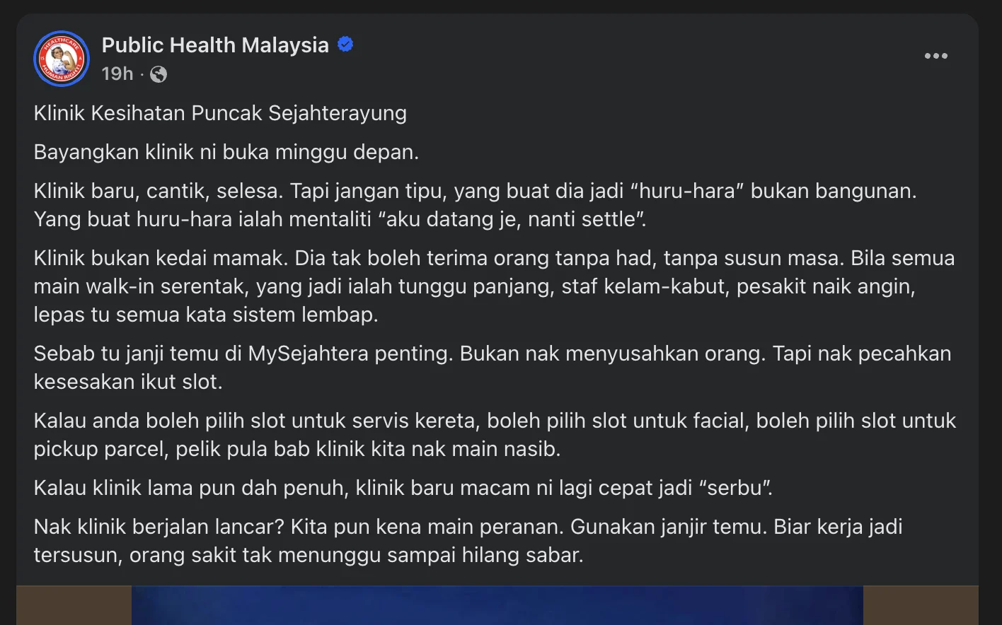 Perkongsian Public Health Malaysia tentang pembukaan Klinik Kesihatan Puncak Sejahterayung mengingatkan orang ramai bahawa kesesakan bukan berpunca daripada bangunan atau kemudahan semata-mata. Punca sebenar sering kali ialah mentaliti “datang sahaja, nanti settle”.