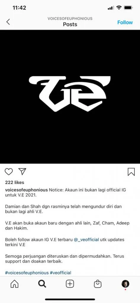 “Terus sokong dan doakan yang terbaik,” kata kumpulan itu melalui hantaran di akaun IG @voicesofeuphonious.
