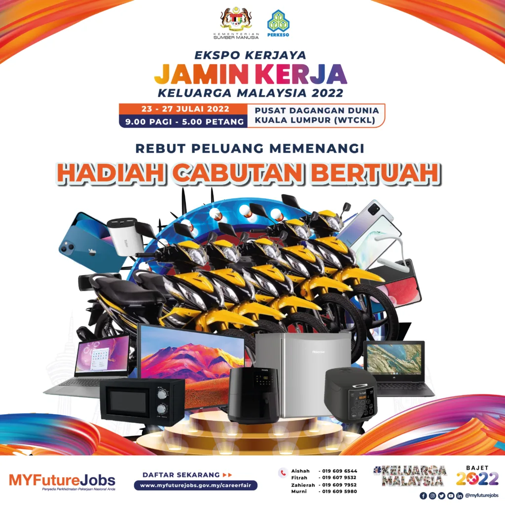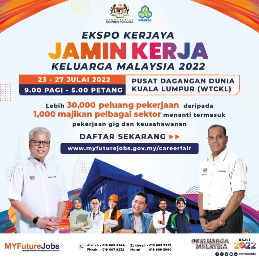 Prihatin terhadap isu pengangguran dan jurang yang wujud antara penawaran dan permintaan pekerjaan di negara ini, Kementerian Sumber Manusia (KSM) melalui Pertubuhan Keselamatan Sosial (PERKESO) akan menganjurkan Ekspo Kerjaya Jamin Kerja Keluarga Malaysia 2022 khusus untuk seluruh Keluarga Malaysia.