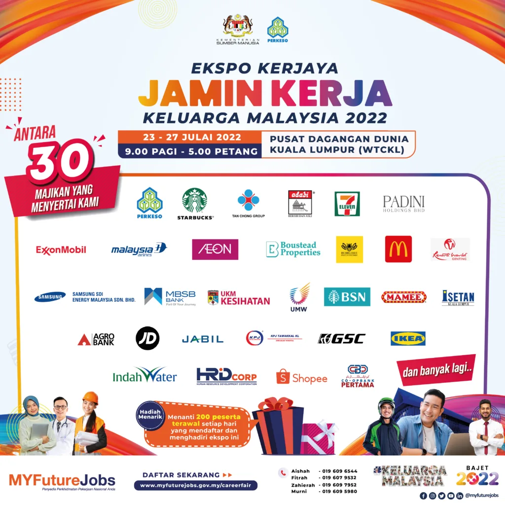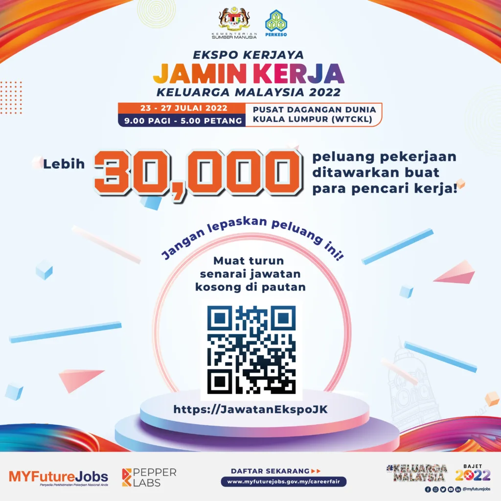 Ekspo kerjaya ini akan diadakan selama lima hari dari 23 hingga 27 Julai 2022 bertempat di Pusat Dagangan Dunia (WTC), Kuala Lumpur. Ia bakal menjadi karnival pekerjaan terbesar dan julung kali diadakan pada tahun ini bagi mencapai sasaran Kerajaan untuk mencipta 600,000 peluang pekerjaan melalui ‘Inisiatif Jamin Kerja Keluarga Malaysia’ di