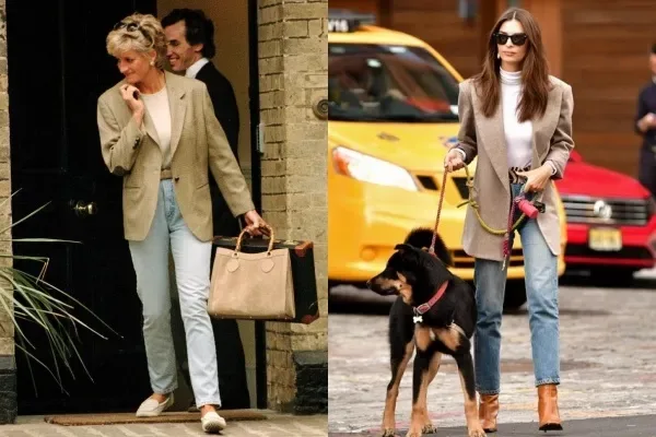 4. Dan gaya jalanan 80-an ini juga pernah digayakan oleh Emily Ratajkowski. Dia mengenakan gaya dan shade yang sama iaitu blazer dalam rona earth tone serta seluar jeans vintaj.