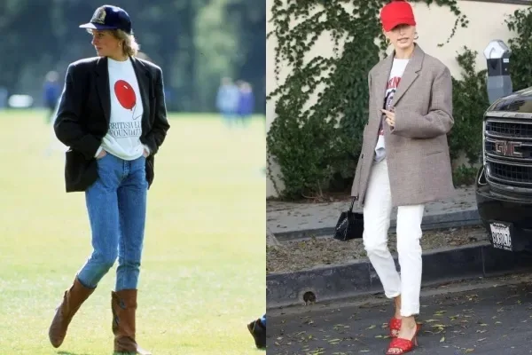5. Antara gaya jalanan Puteri Diana yang agak popular dan ikonik adalah padanan topi besbol, t-shirt, jeans dan but koboi. Tetapi Hailey Bieber telah ubah sedikit gaya tersebut dengan mengenakan kasut tinggi.