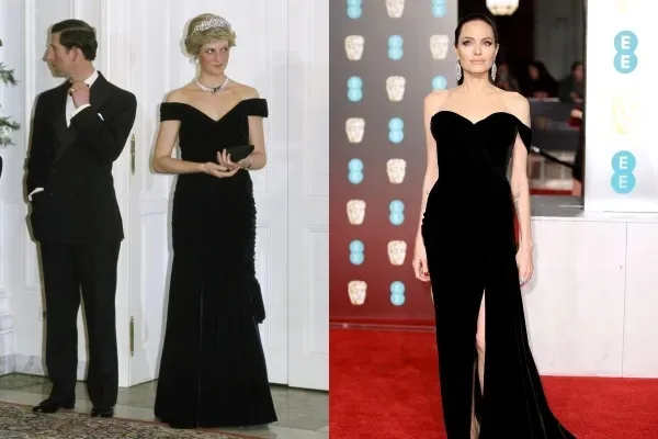 6. Nampak simple tapi gaun baldu off-shoulder dalam rona hitam yang dipakai oleh Puteri Diana ini pernah diolah semula oleh Angelina Jolie. Elak nampak kosong di bahagian atas badan, kenakan anting-anting seperti chandelier earring atau pun rantai jenis collar atau esclavage.