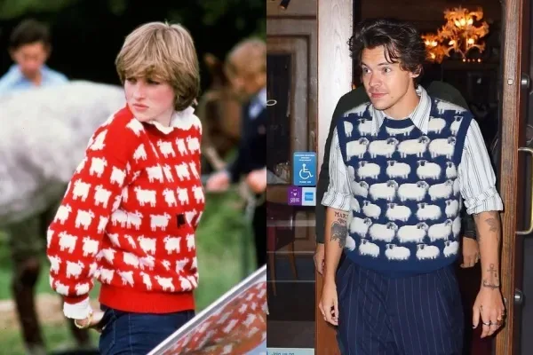 7. Tak ketinggalan juga fesyen kasual Puteri Diana di mana Harry Styles juga pernah ‘tiru’ semula gayanya. Bercorak kambing biri-biri, Puteri Diana mengenakan pullover dalam rona merah, Harry pula kenakan vest dalam rona navy blue.