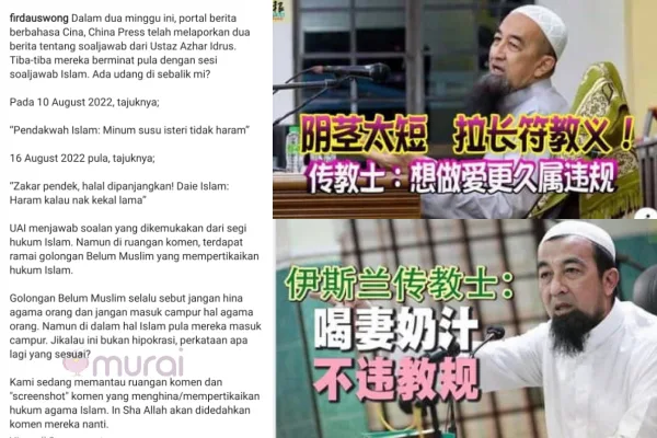 “Dalam dua minggu ini, portal berita berbahasa cina, China Press telah melaporkan dua berita tentang soal jawab dari ustaz Azhar Idrus. Tiba-tiba mereka berminat pula dengan sesi soal jawab Islam. Ada udang di sebalik mi?