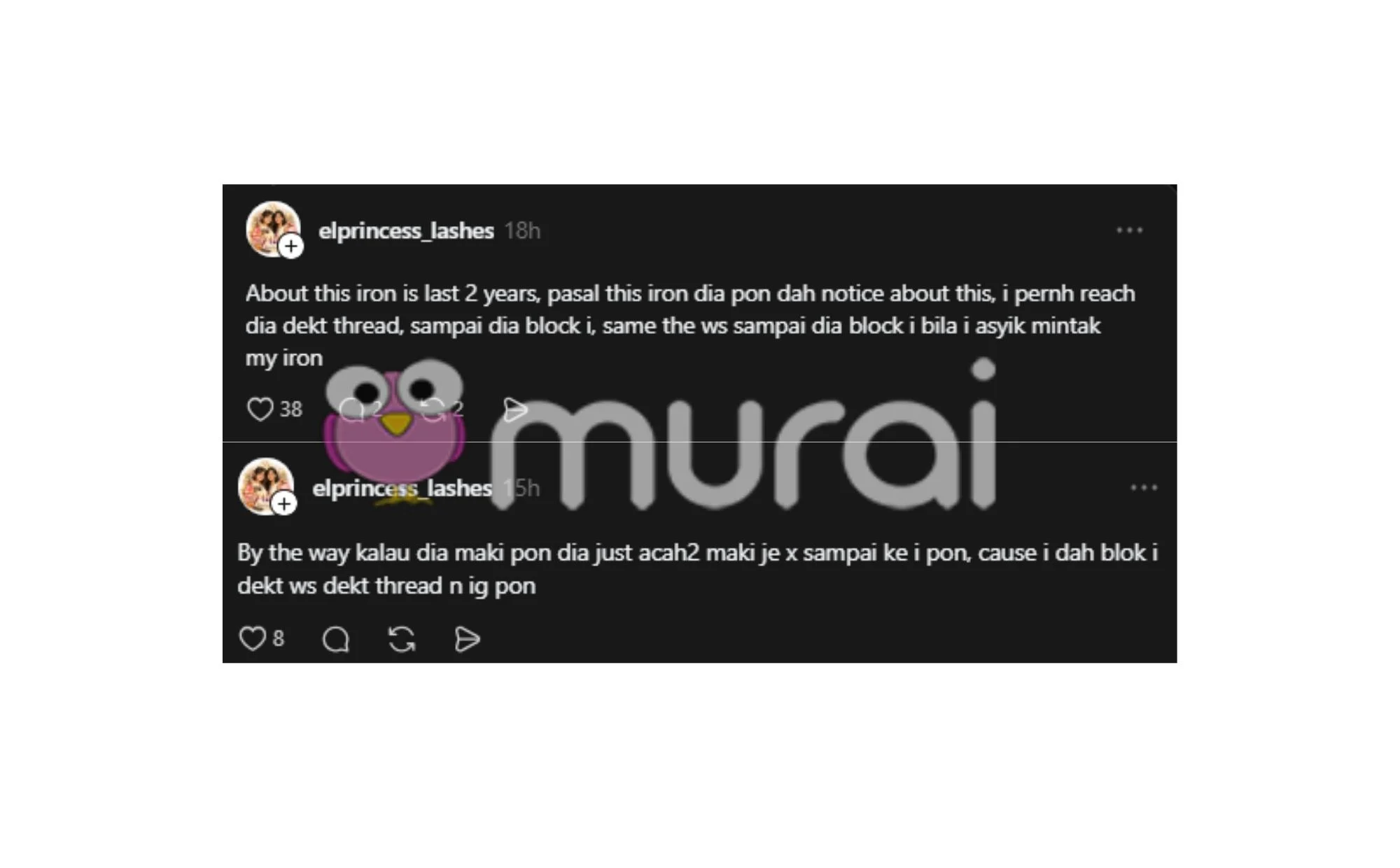 Namun tiada siapa yang dapat jangkakan, Sarah hanya memulangkan sebuah seterika sahaja. Apabila ditanya mengenai seterika yang belum dipulangkan, Sarah telah menyekat akaun wanita tersebut.