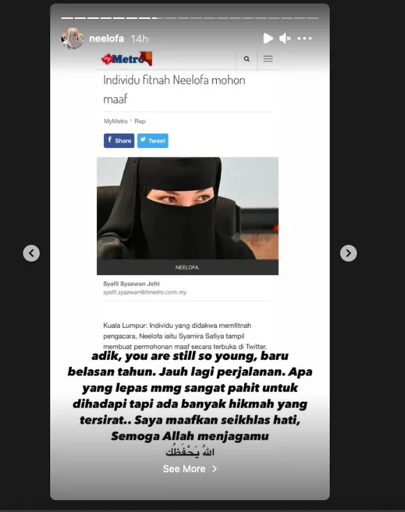 “Saya maafkan seikhlas hati, semoga Allah menjagamu” tulis Neelofa.