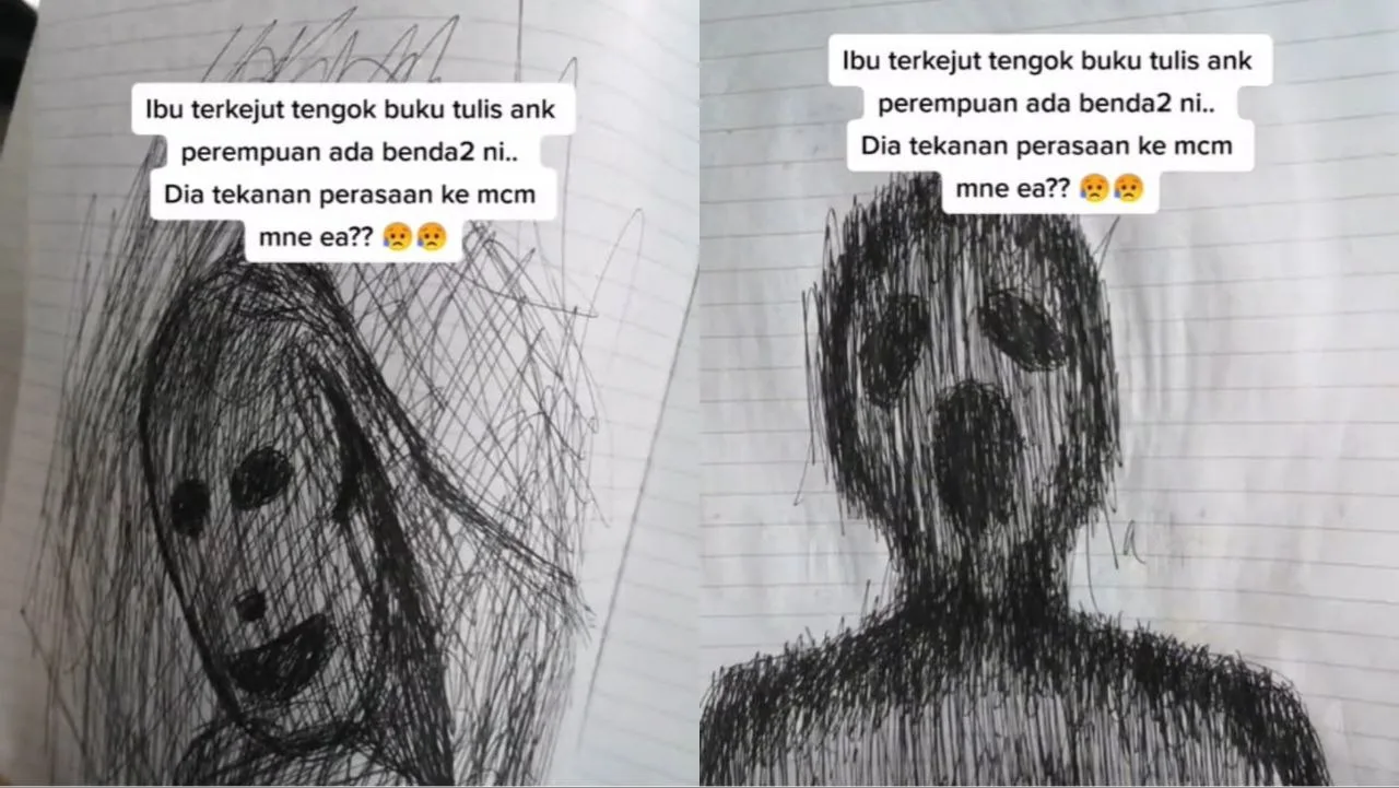 Tular di tiktok di akaun @nicky_13101, video lukisan- lukisan yang menyeramkan dilukis. Video tersebut dikongsi oleh seorang ibu yang awalnya hanya mahu memeriksa buku kerja sekolah anaknya.