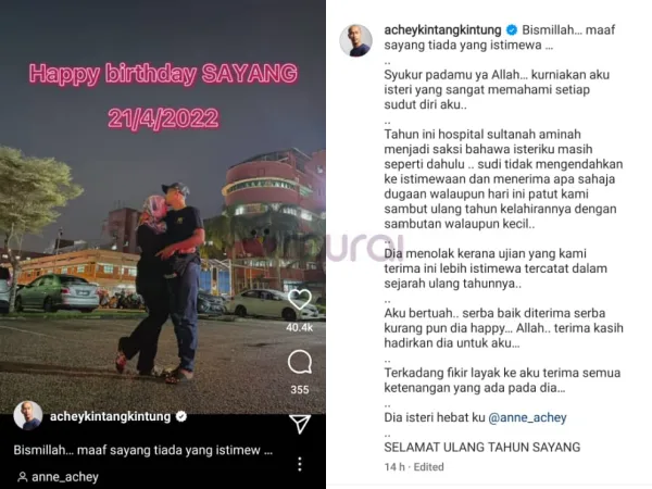 Walaupun Achey setia menanti laporan kesihatan ibunya di luar hospital, selebriti berbakat ini tidak lupa menitipkan ucapan sempena hari lahir isteri tercinta pada hari ini di media sosialnya.